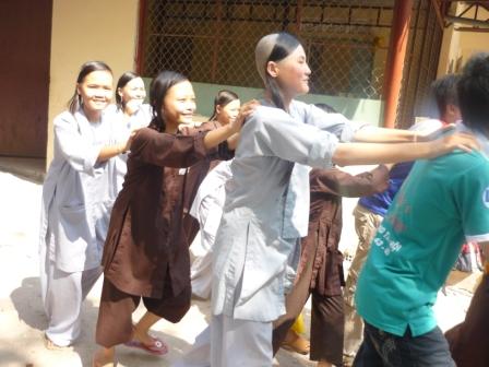 Sau một chặng đường khá dài, qua 3 tuyến xe buýt 150, 11, 6 và khoảng 3km đi bộ, chúng tôi cũng đến nơi. Từ xa chúng tôi đã thoáng trông thấy bọn nhóc đang chơi đùa trước sân trong cái khung cảnh thanh tịnh,yên bình,giản dị của nơi đây. Những nụ cười tươi tắn, ngây thơ cùng ánh mắt sáng lên niềm vui của các bé như điểm tô thêm cho bức tranh ngày mới thật trong lành với những tia nắng đầu ngày ửng hồng dịu nhẹ. Chợt có cảm giác thân thương,gần gũi dậy lên trong lòng chúng tôi. Sau khi chào hỏi Sư cô và mọi người, chuẩn bị những thứ cần thiết, chúng tôi bắt đầu tập hợp các bé lại và chơi trò chơi. Các trò chơi tập thể như Sóng biển, thằng Cu Tí, Bắt cá…được các bé hưởng ứng rất nhiệt tình. Đặc biệt là trò chơi Tùng, Cắc với hai đội Bò Sữa và Chim cánh cụt.